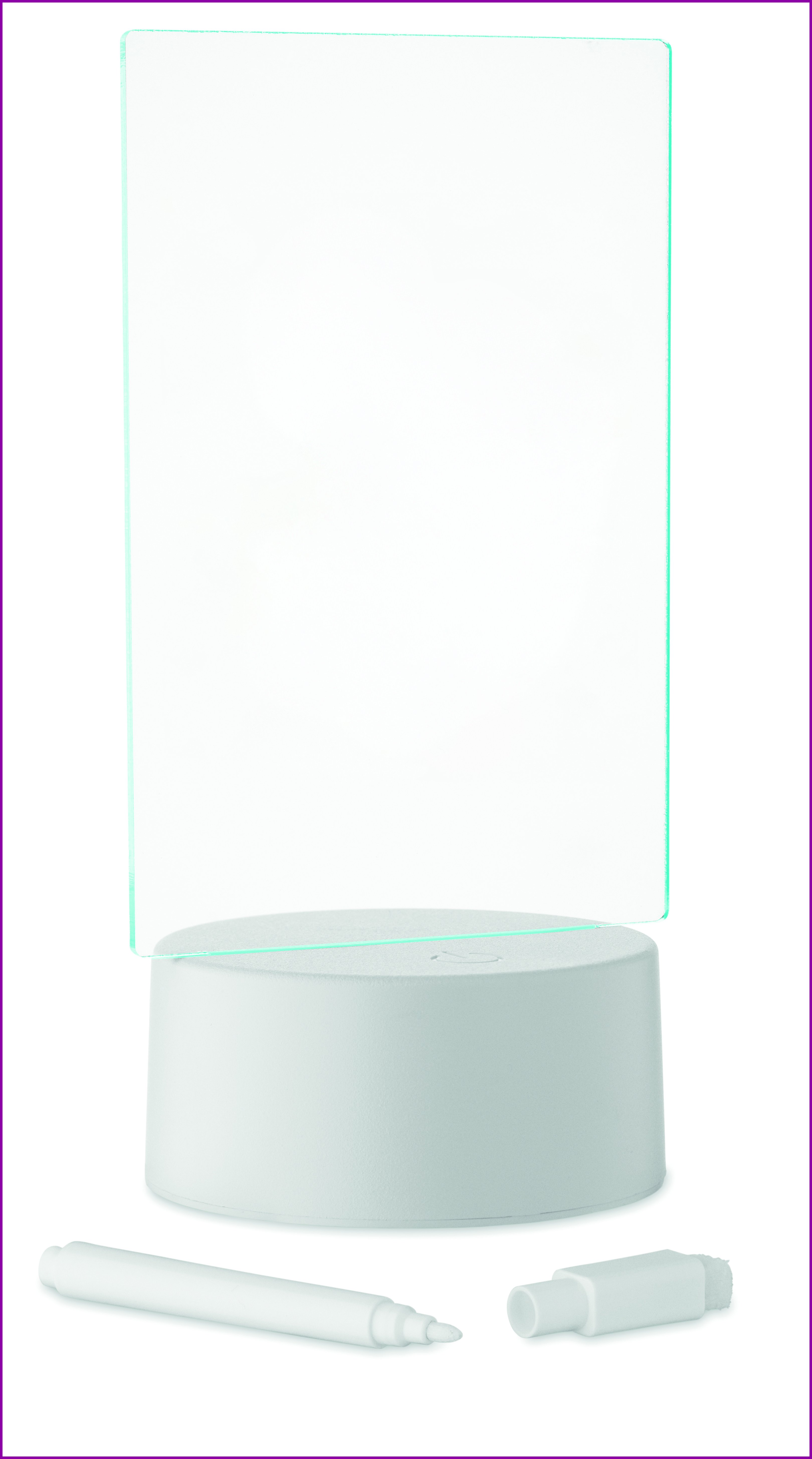 Valaistu LED-muistitaulu, jossa on väriä vaihtava valo ja pyyhittävä valkoinen tussi. Akryylitaulu ja PS jalusta. Paristokäyttöinen, vaatii 3 AAA-paristoa (eivät sisälly pakkaukseen).