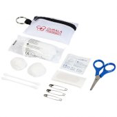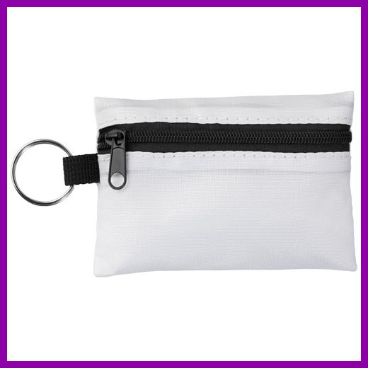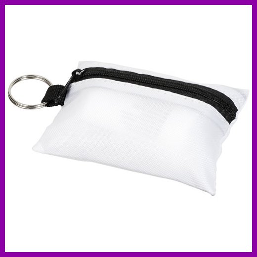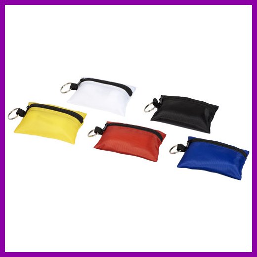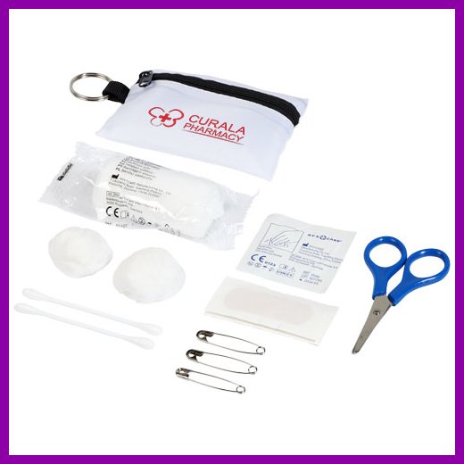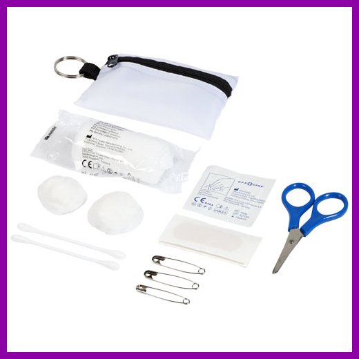 Kätevä polyesteripussi avaimenperällä sisältää 16 ensiaputarviketta. Pakkauksessa sakset (9 cm), 2 ihon puhdistuspyyhettä, 1 joustava side (4 m x 6 cm), 2 pumpulityynyä (0.5g), 3 hakaneulaa (3.6 cm), 5 laastaria (45x19 mm) ja 2 pumpulipuikkoa (8 cm). Sopii hienosti matkoille, festivaaleihin, tapahtumiin ja muuhun ulkoiluun. Pussissa on suuri logomerkintäalue. Ensiapupakkausta pidetään lääkinnällisenä laitteena, ja se on 93/42/EEC-asetuksen alainen käyttötarkoituksensa perusteella: ”sairauden diagnosointi, ehkäisy, seuranta, hoito tai lievitys”. Tämä lääkinnällinen laite kuuluu LUOKKAAN I, ls.Värit ja Koot