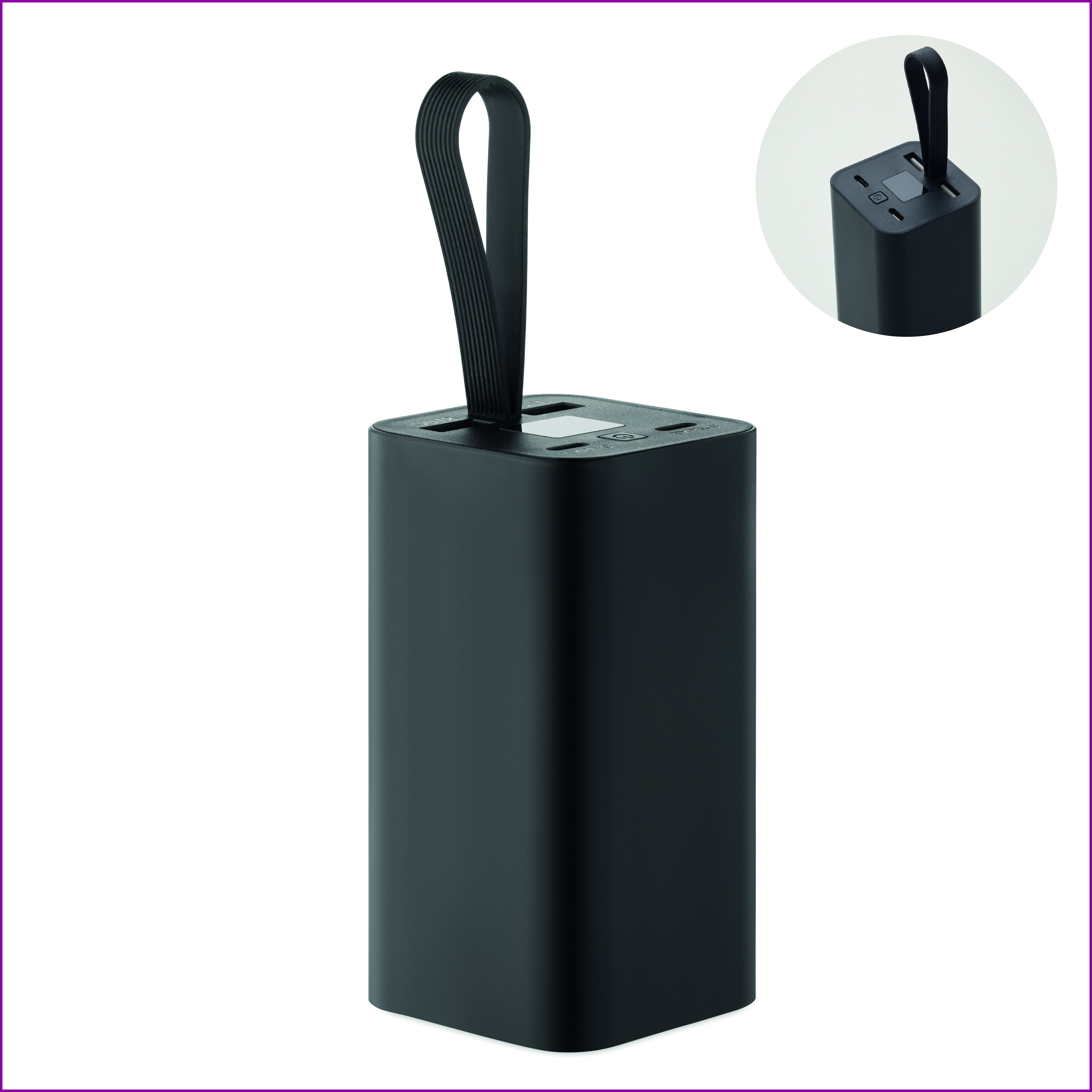 20 000 mAh:n varavirtalähde kierrätetystä alumiinista, jossa on digitaalinen virtanäyttö ja silikoniripustus. Sisältää kaksi Type-C- ja kaksi USB-A-lähtöä sekä PD 65W pikalatauksen.