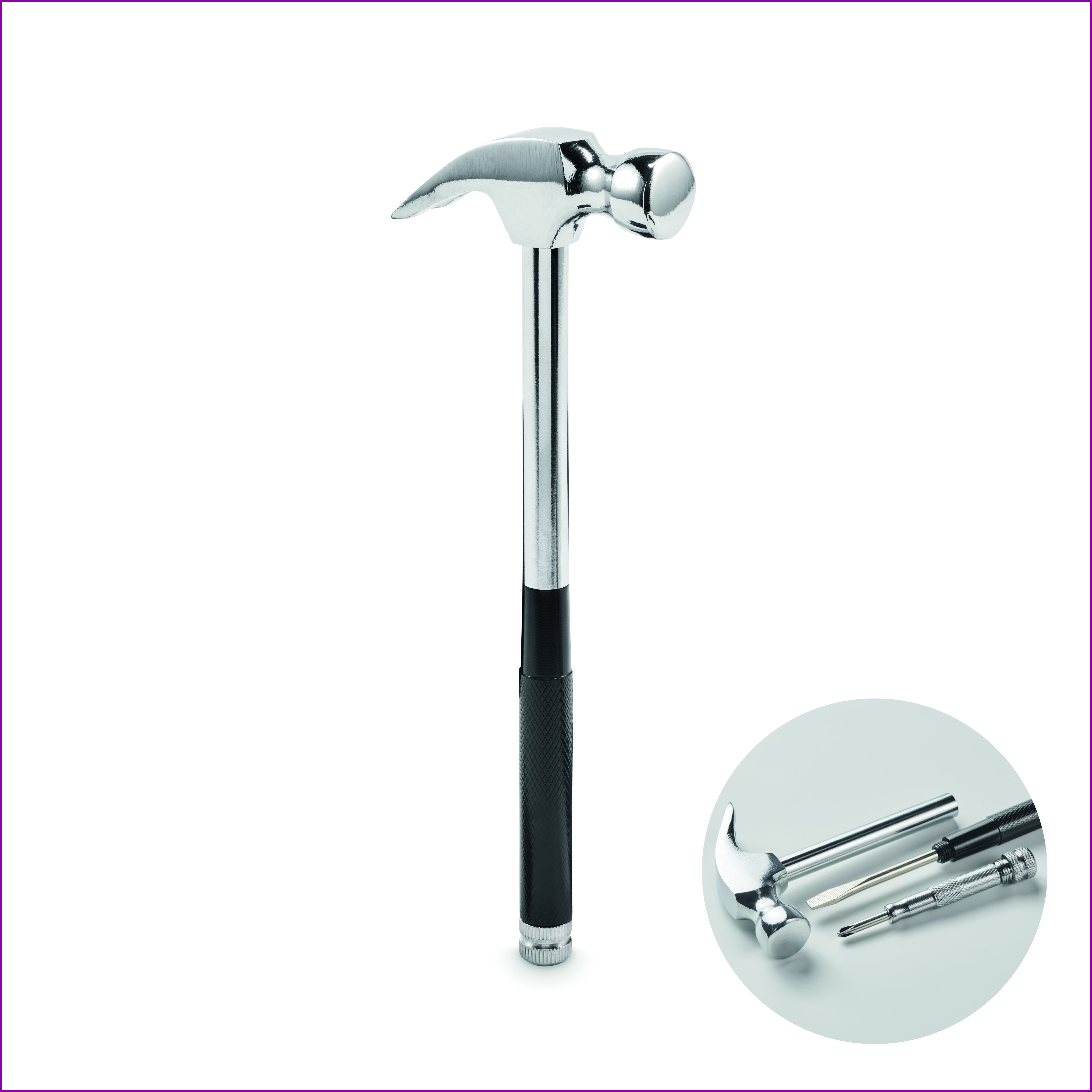 Kärkivasara ja ruuvimeisseli hiiliterästä. Kahvaan integroidut 4 vaihtopäistä ruuvimeisseliä.