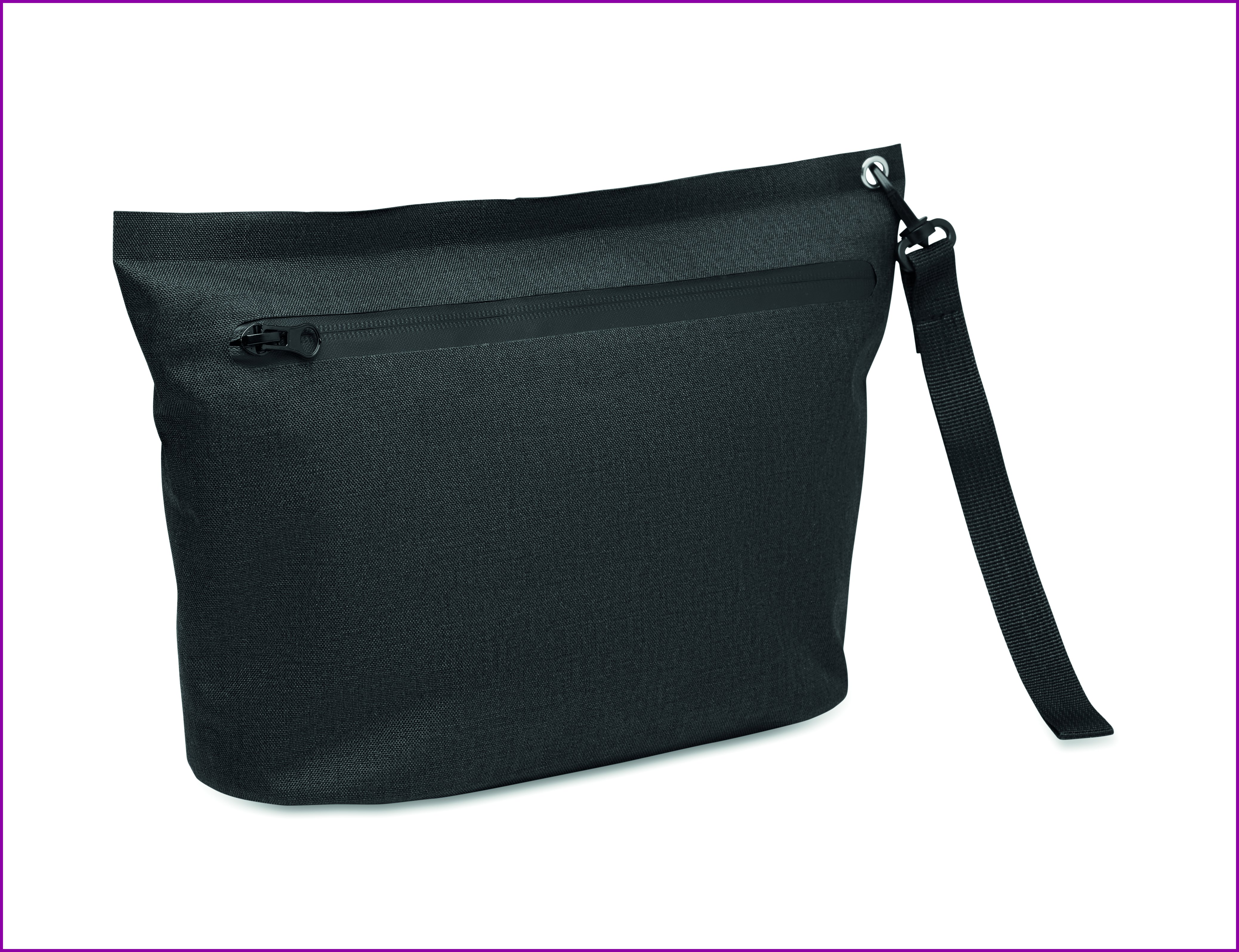 Henkilökohtaisille tavaroille tai asiakirjoille tarkoitettu tasku 300D RPET-muovista ja PVC-päällysteisestä materiaalista, jossa rannehihnat. Vedenkestävä kangas.