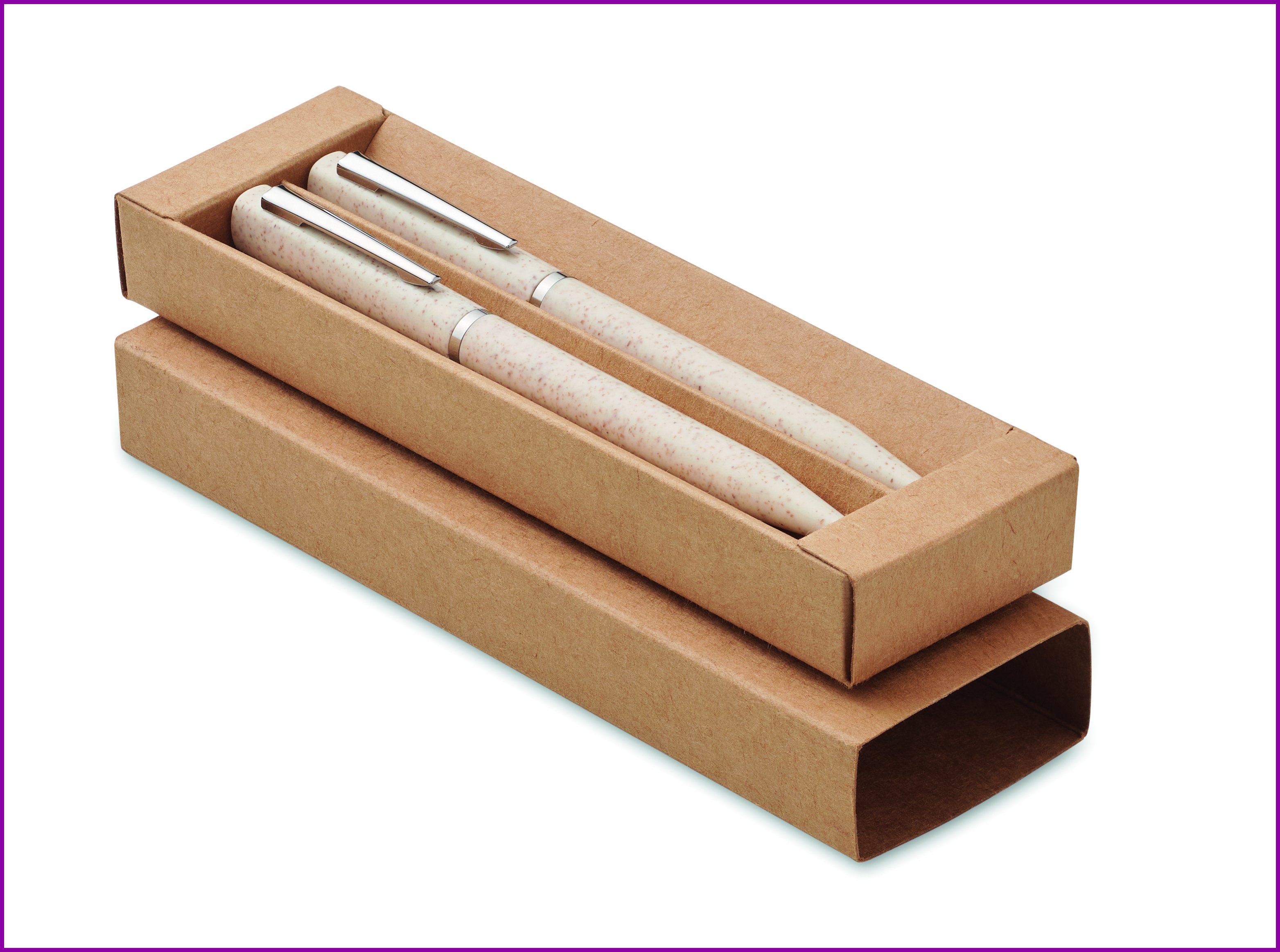 Vehnän olki/ABS-kynäsetti, jossa on 1 kierrekuulakärkikynä sinisellä musteella ja 1 kierrekirjoitinkynä grafiittisella musteettomalla kuulakärkikynällä. Toimitetaan kierrätyspaperirasiassa. FSC®-certified | FSC MIX, P5.1, FSC-C213206