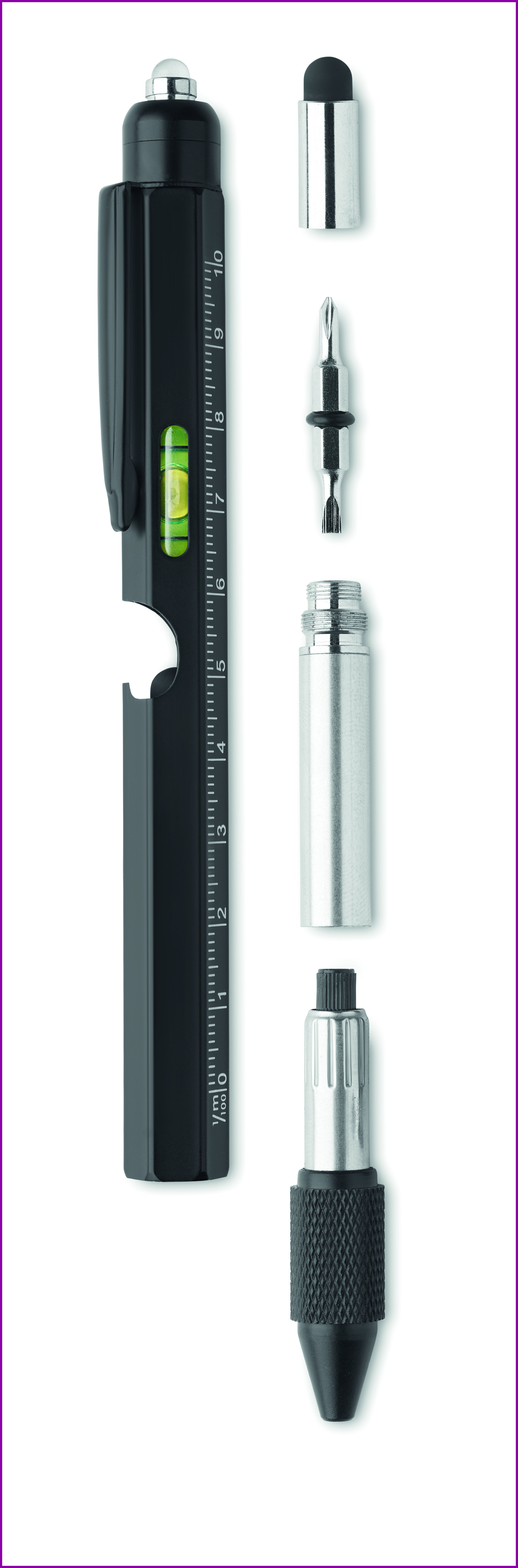 Ruostumattomasta teräksestä valmistettu kierrettävä vesivaakakynä, jossa on viivoitin, kynän ja Phillips- ja litteäpäiset ruuvimeisselit sekä LED. Mukana 3 AG-paristoa. Sininen muste.