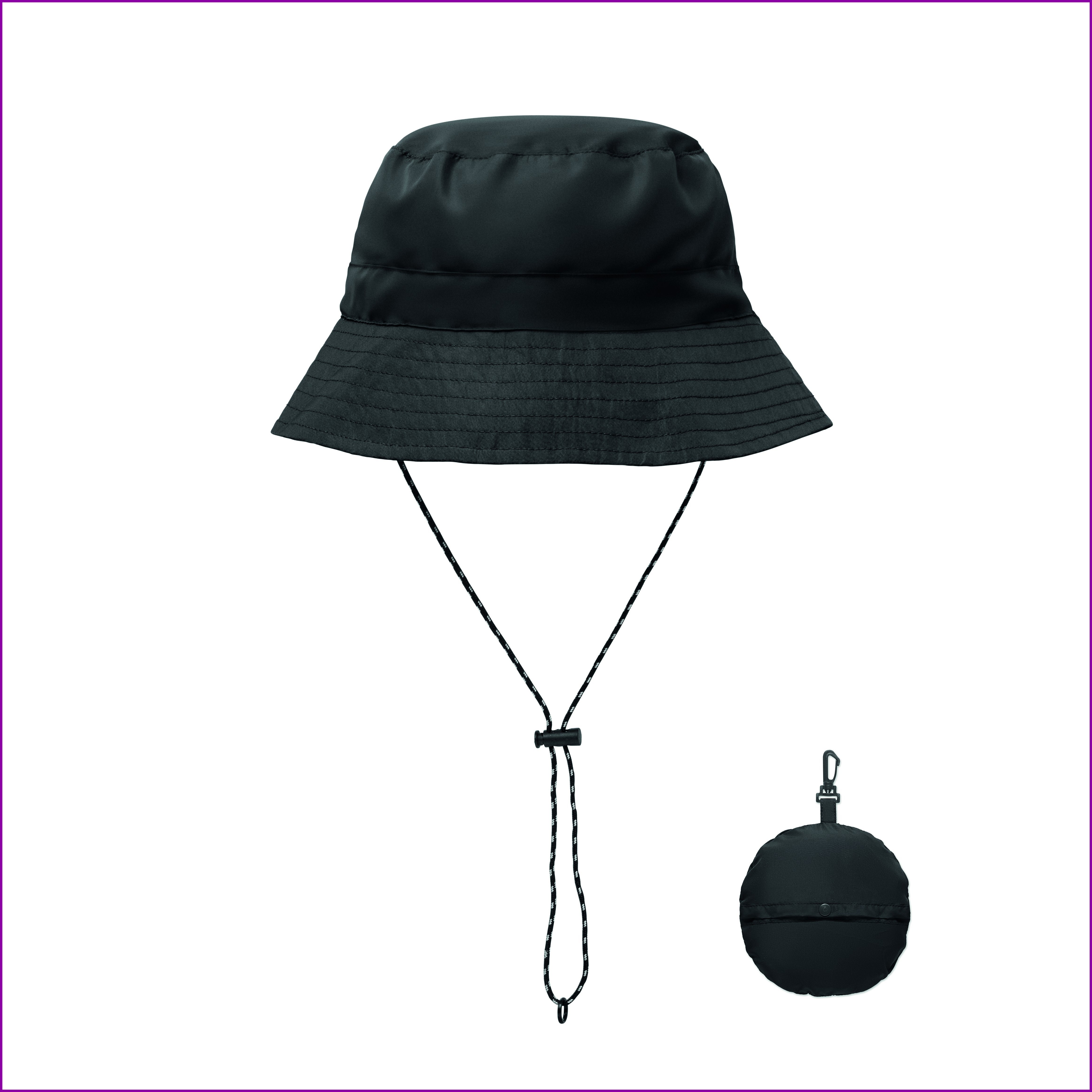 Vettähylkivä kalastajanhattu polyesteristä, mukana oma säilytyspussi ABS-karabiinilla. 64 g/m².