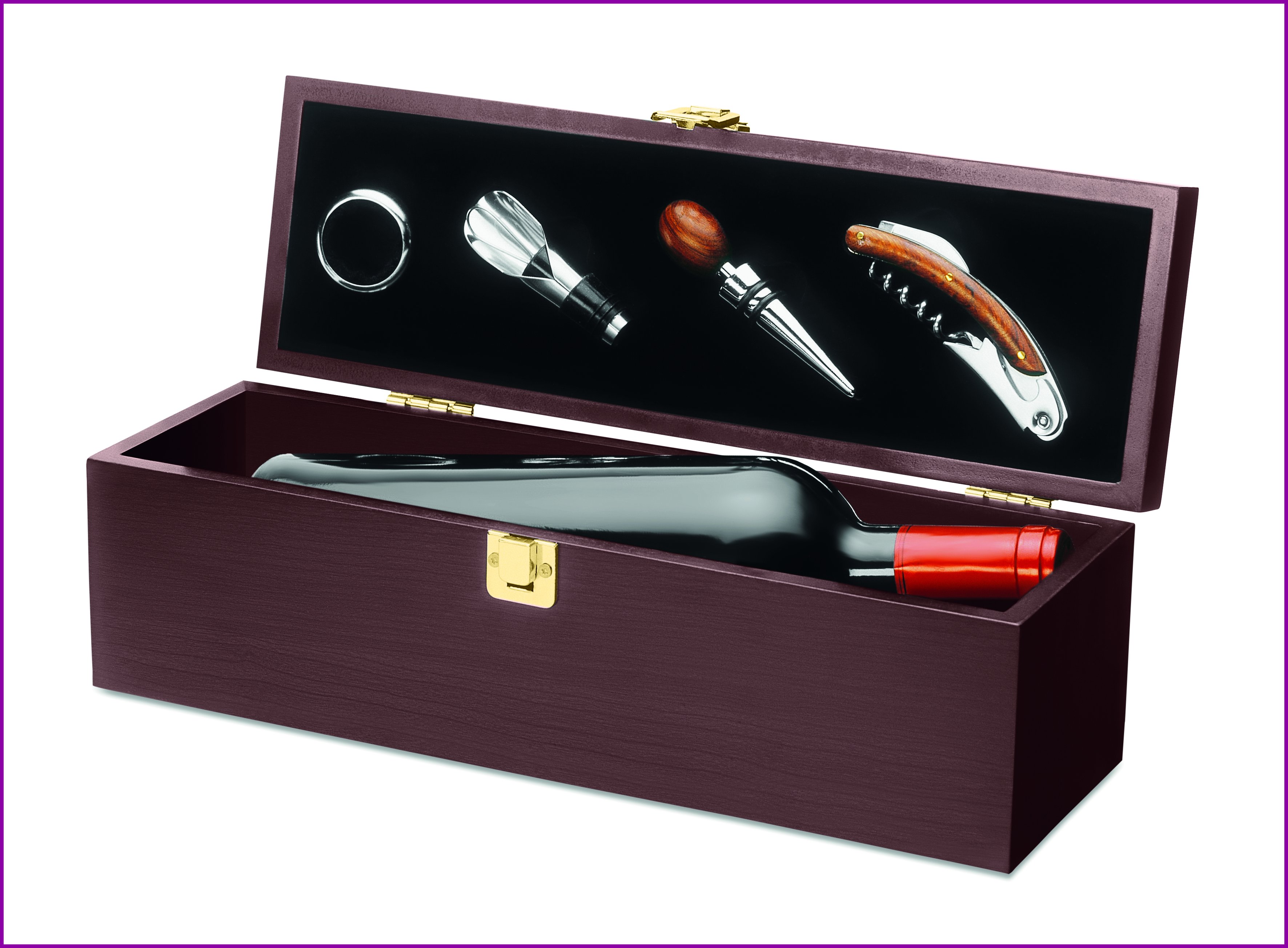 Viinisetti puisessa lahjalaatikossa, laatikossa on tilaa yhdelle viinipullolle. Sisältää tippa kauluksen, kaatonokan, viinikorkki ja korkkiruuvin. Viinipullo ei sisälly hintaan.