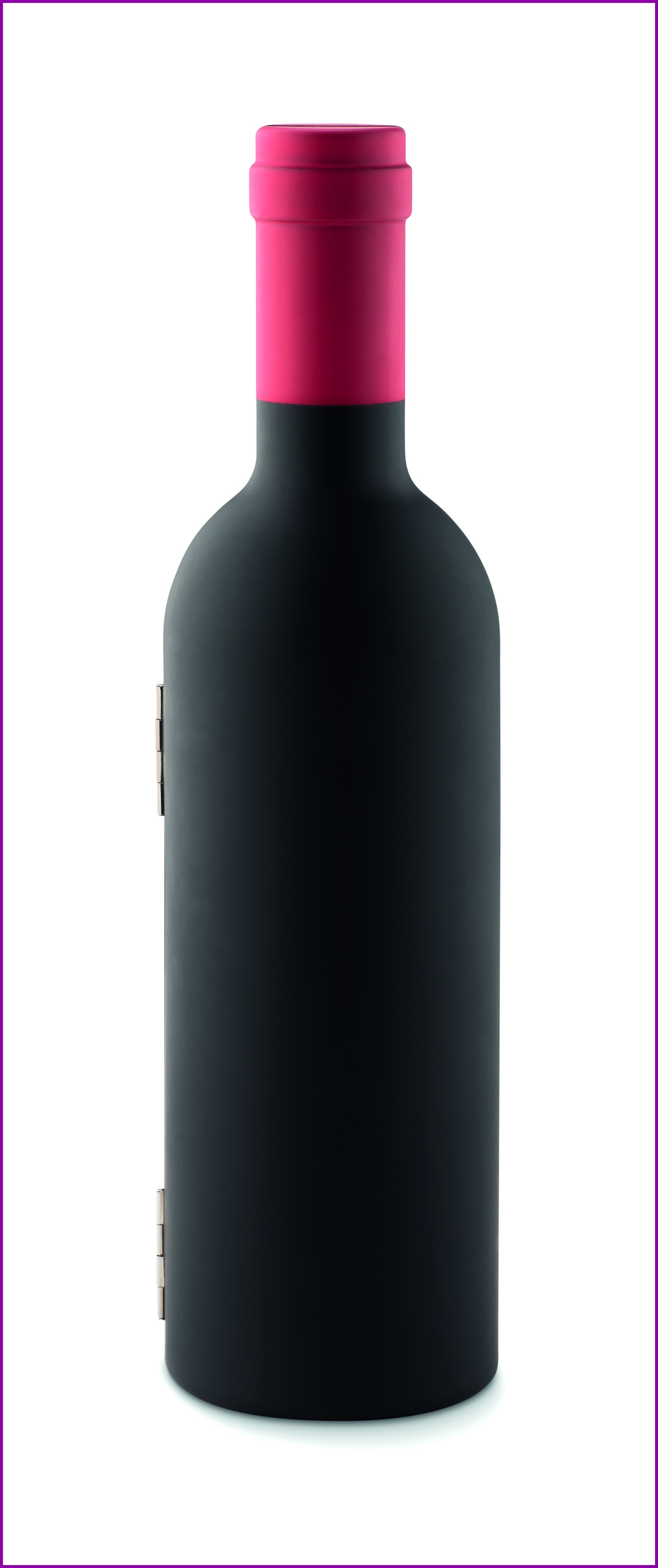 Viinisetti pullon muotoisessa laatikossa, sisältää viinitulpan, korkkiruuvin ja viinikauluksen. Laatikossa magneettinen suljin.