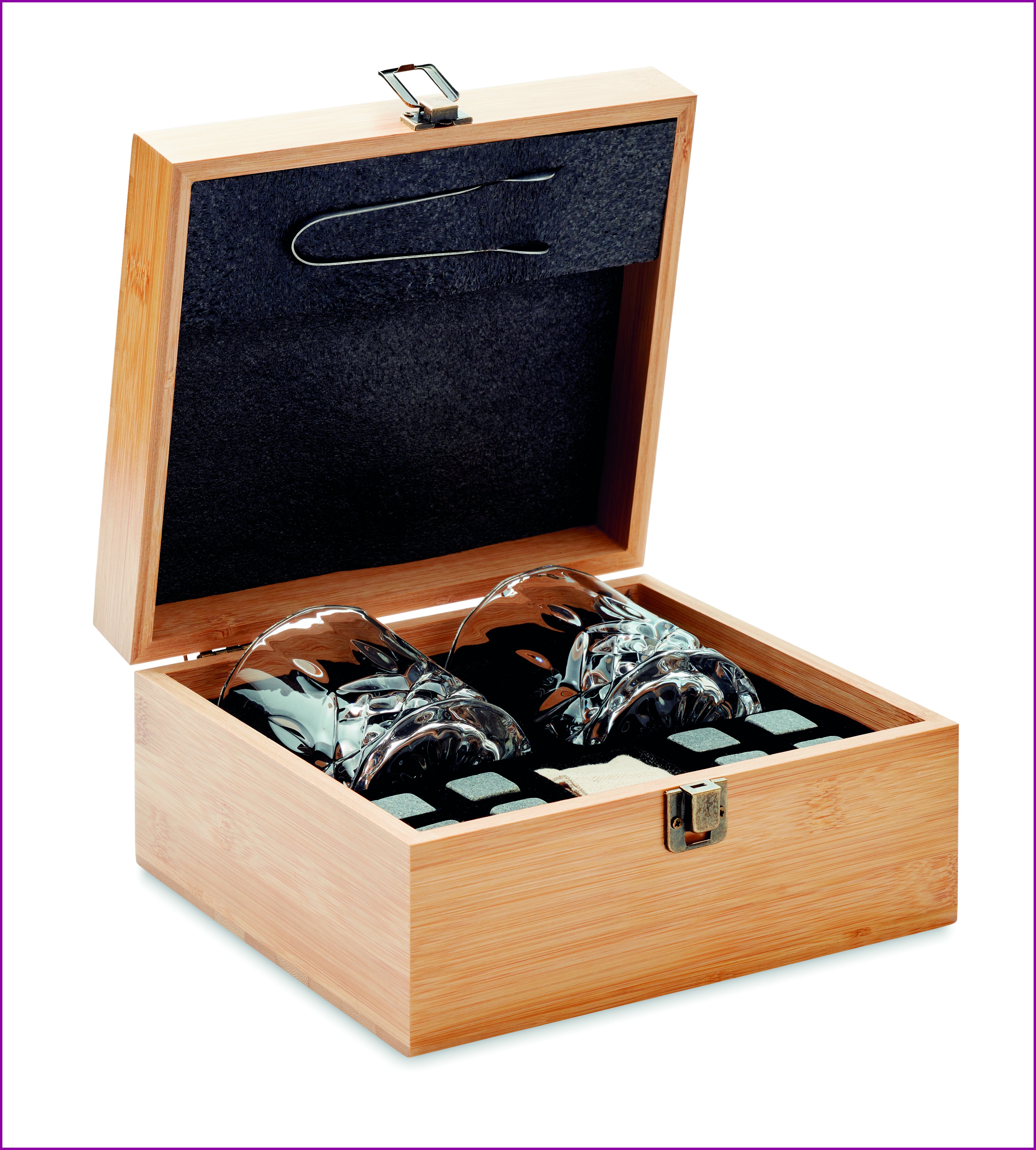 Ylellinen viskisetti bambulaatikossa. Sisältää kaksi viskilasia (300ml), kahdeksan uudelleenkäytettävää kivijääpalaa, pihdit ja puuvillapussukan. Luonnollisen materiaalin (bambu) vuoksi, tuotteiden värissä/ koossa saattaa olla erinäisyyksiä ja tämä voi vaikuttaa painatuksen lopputulokseen.