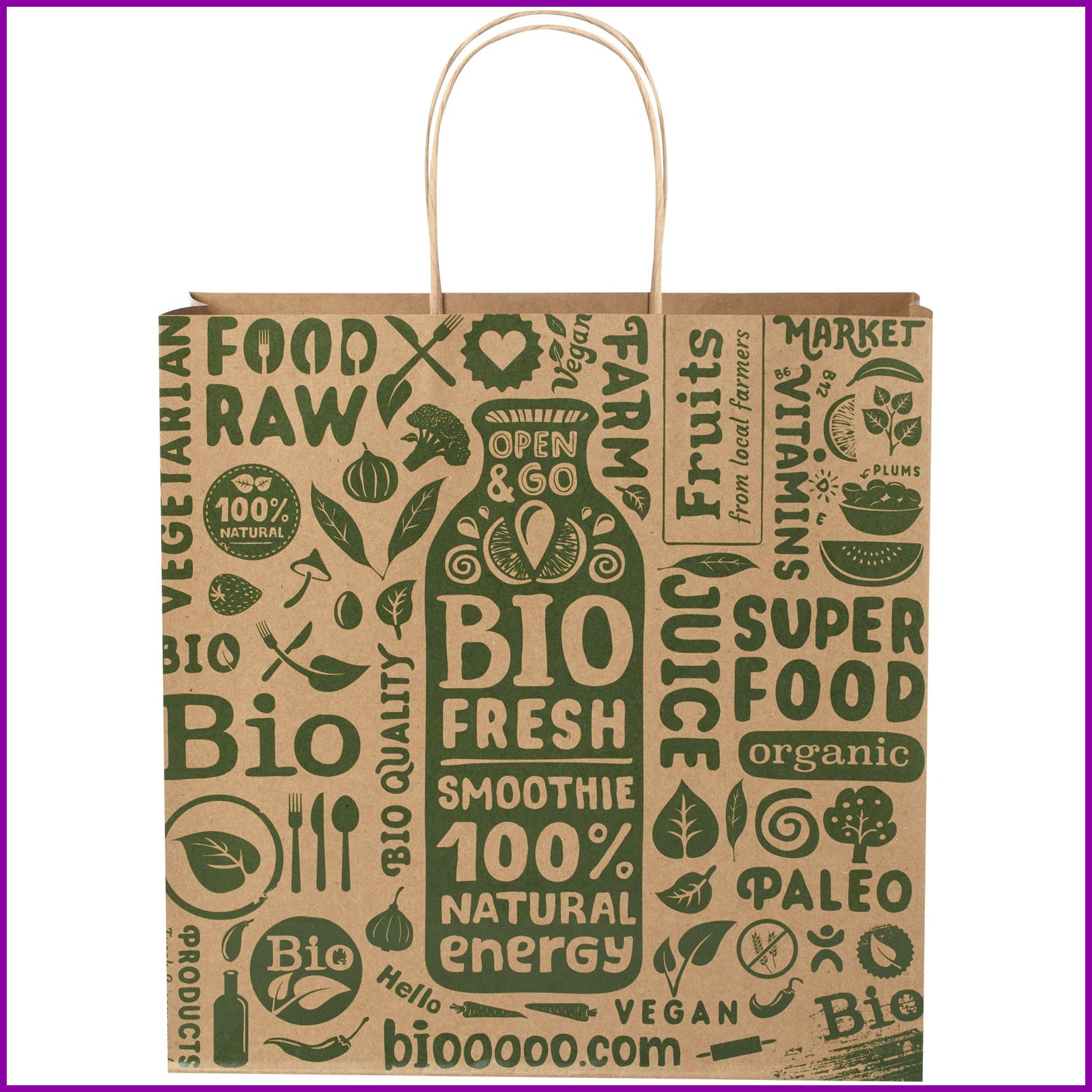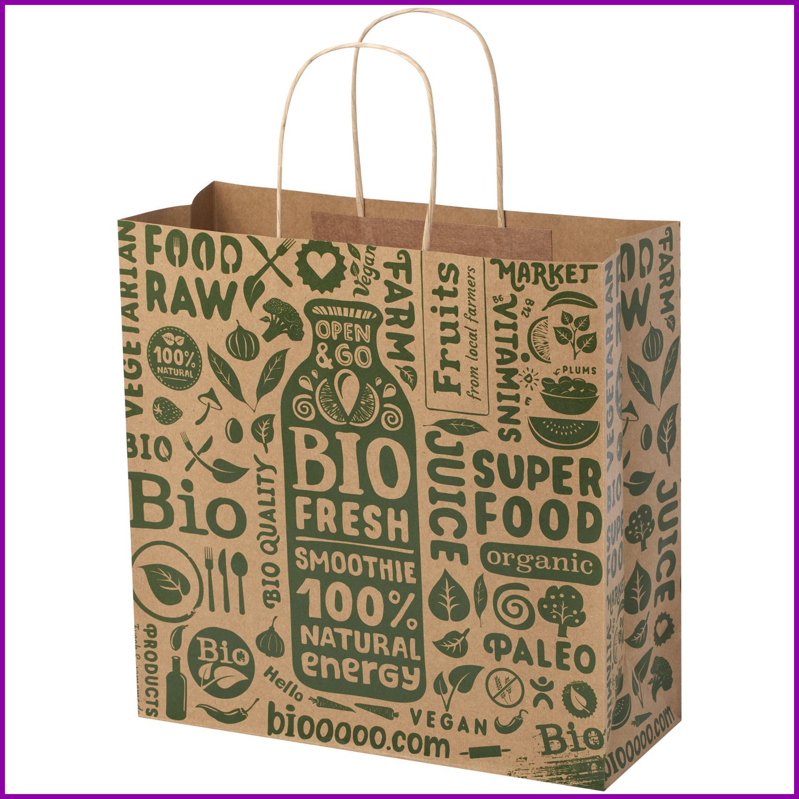 Erittäin suuri 120 g/m2-voimapaperikassi (31 x 12 x 31 cm) paperisilla kierrekahvoilla. Etu- ja takaosassa on runsaasti tilaa logon tai minkä tahansa muun kuvion painattamiseen, joten kassi sopii erinomaisesti markkinointiviestin välittämiseen. Euroopassa valmistettu ja 100-prosenttisesti kierrätettävä kassi on vastuullisempi valinta ympäristötietoisille yrityksille, jotka etsivät luontoa säästävää pakkausratkaisua.