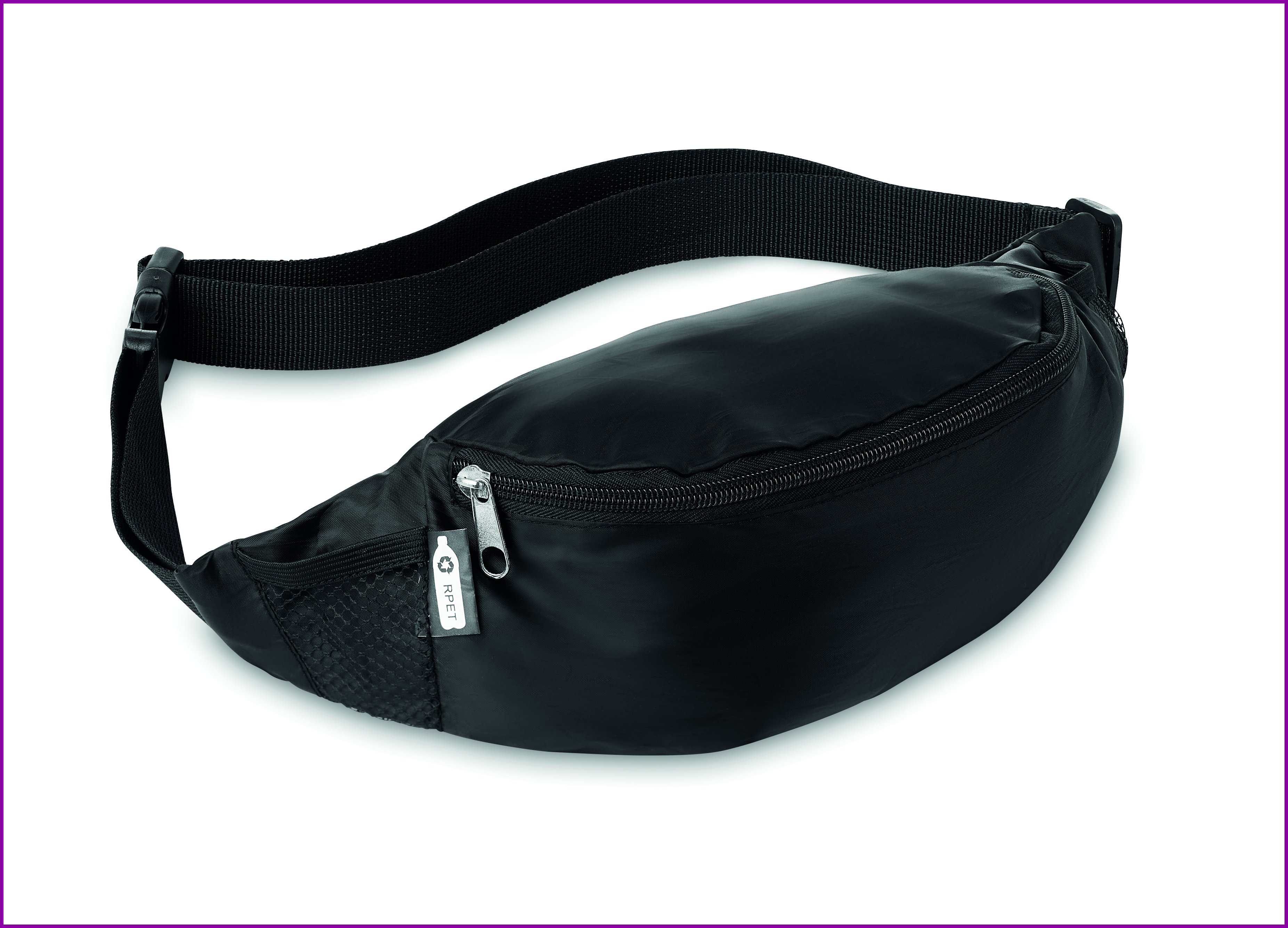 210D RPET vyölaukku, säädettävällä vyötärönauhalla ja päälokero vetoketjulla.